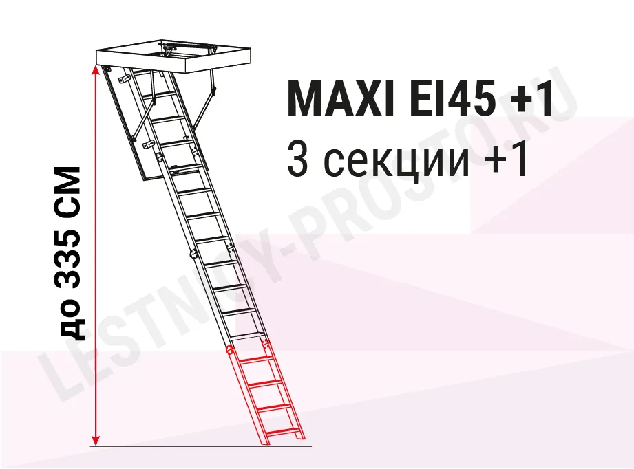Модель лестницы MAXI EI45 идеально подходит для установки в помещениях подверженных возгоранию, её противопожарные свойства позволят эффективно изолировать помещение, в котором возник пожар, от чердака, тем самым предотвращая дальнейшее распространение огня. Лестница имеет в комплекте нескользящие насадки на ножки, которые идеально прилегают к полу, предотвращают появление царапин и придают лестнице эстетичный вид после ее резки (подгонки по высоте).
