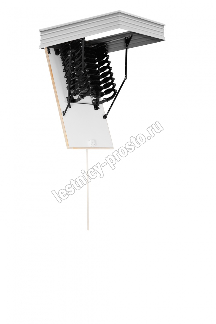 Все элементы лестницы выполнены из экологически чистых материалов и обработаны веществами, не содержащими тяжелых металлов. На ступенях антискользящие насечки. Короб лестницы изготовлен из металла. Термоизоляционная крышка типа "сэндвич" утеплена пенопластом, облицована с двух сторон ДСП белого цвета. Короб люка с уплотнителем. В комплекте деревянный стержень для открывания лестницы.