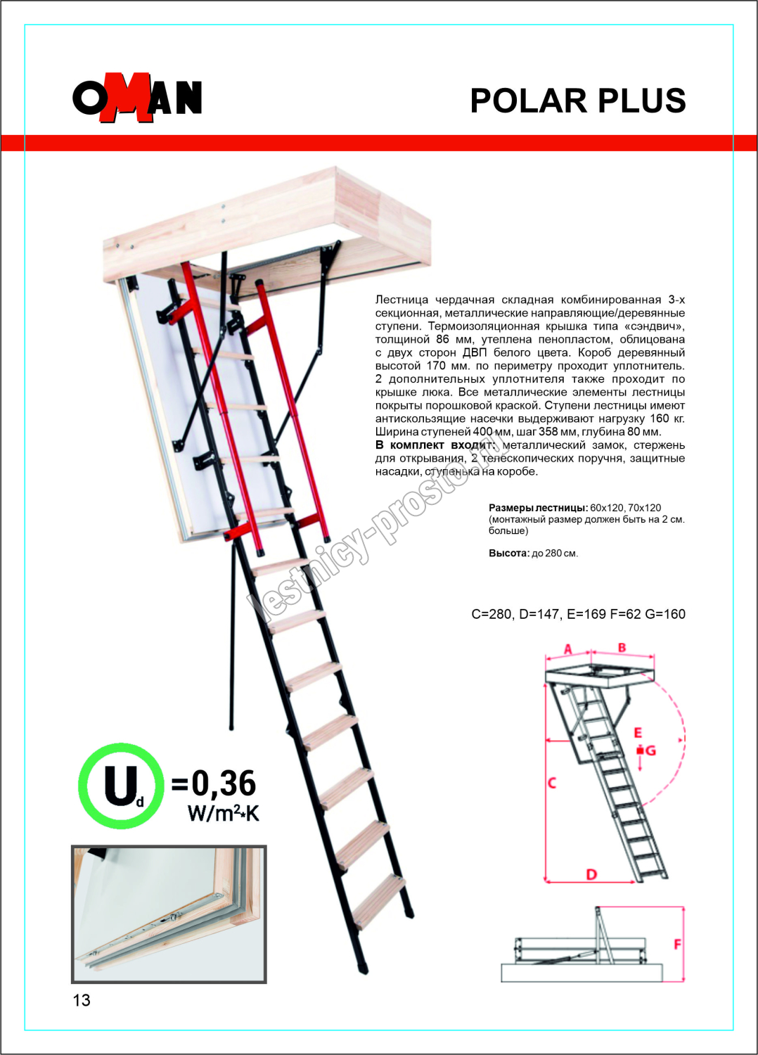 Лестница чердачная, складная, комбинированная 3-х секционная, металлические направляющие/деревянные ступени. Короб люка имеет двухточечную систему запирания. Телескопический поручень имеет внутреннюю пружину и при складывании лестницы служит механическим приводом, что облегчает процесс. Делает его полуавтоматическим. Оборудована дополнительной ступенькой на люке помогающей комфортно подниматься и спускаться. Термоизоляционная крышка типа "сэндвич", толщиной 86мм, утеплена пенопластом, облицована с двух сторон ДВП белого цвета. Лестница подходит для установки в местах с большими перепадами температур. Короб деревянный, высотой 170мм., по периметру проходит уплотнитель. Лестница выпускается для немецкого и английского рынка.