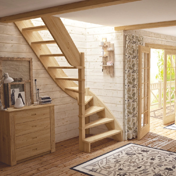 Базовый комплект включает в себя деревянные элементы лестницы и ограждения без какого-либо покрытия.