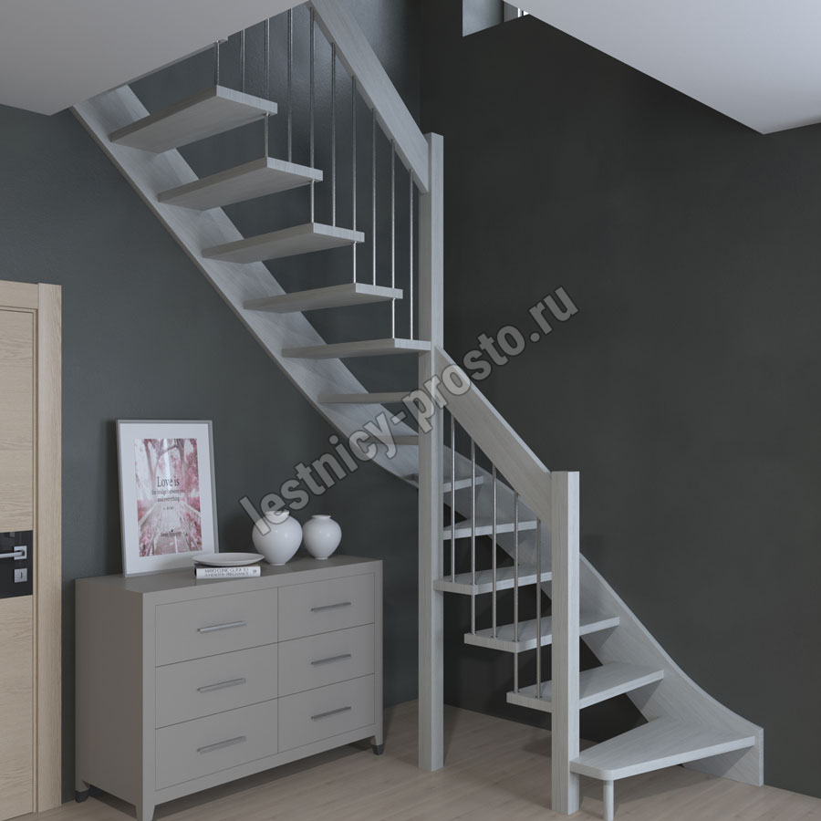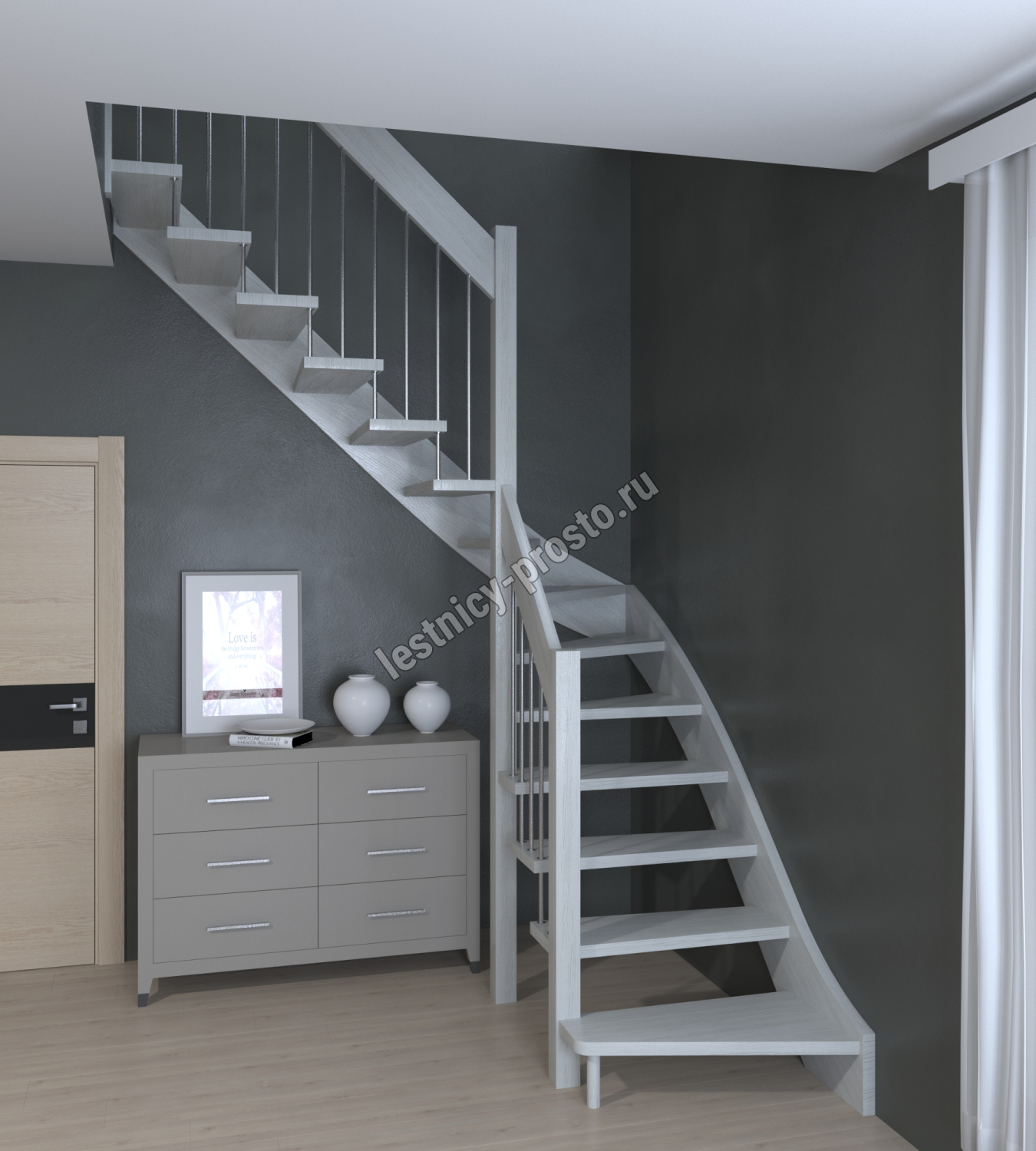 Вид лестницы по реализации поворота: с поворотом на 90° через площадку, с поворотом на 90° через 4 забежные ступени;