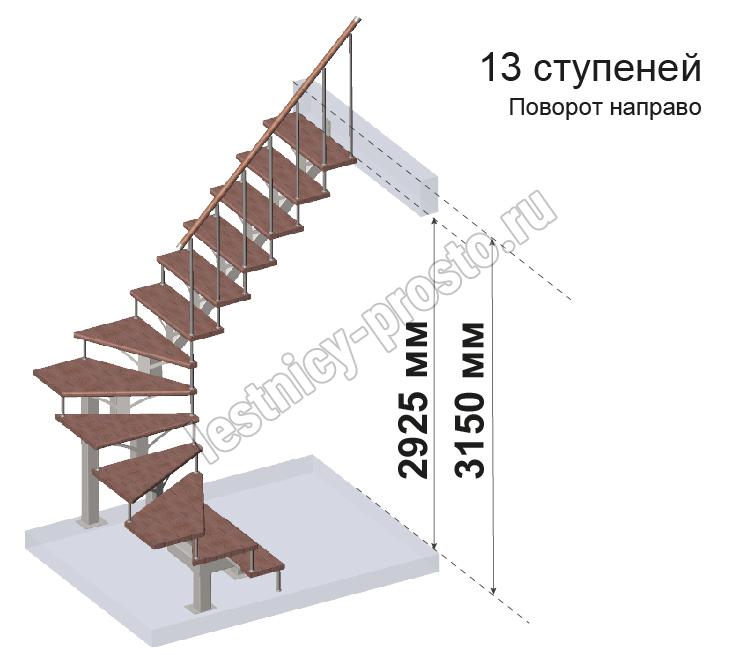 Комплект ограждений для П-образной лестницы MONO h315 из 13 ступеней.