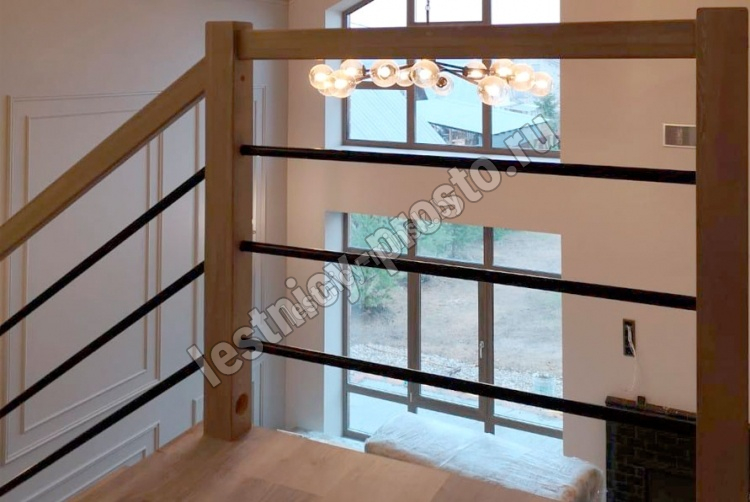 В комплекте: 3 прямых деревянных столба без какого-либо покрытия и профильный поручень без покрытия, комплект из 3 ригелей из стали (окрашены в цвет каркаса или хром по желанию) диаметром 12 мм., необходимая фурнитура.