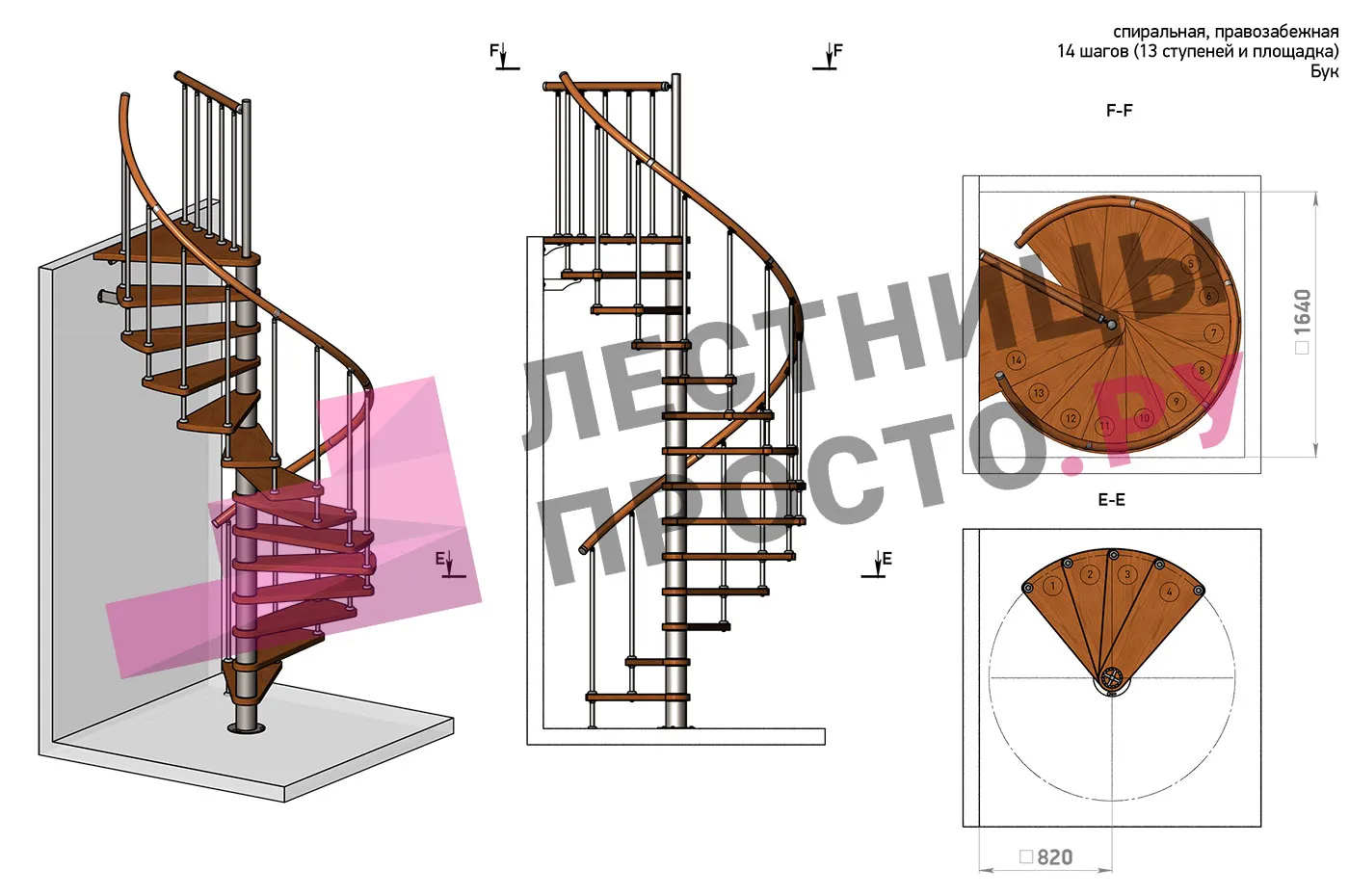 Винтовая лестница Prosto Spiral Black D160см, h303.9-348,1 см, бук