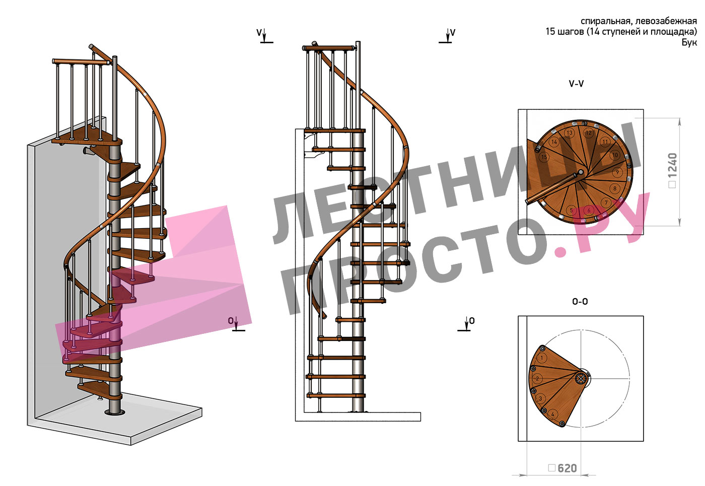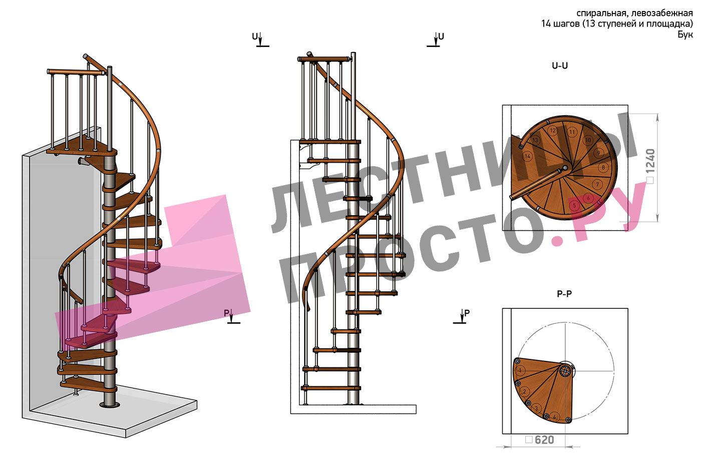 Правая, d=120см, 14 ступеней + площадка