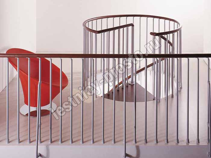 Перила состоят из стальных балясин, окрашенных в черный (RAL 9017), белый (RAL 9010) или серый (RAL 9006). Концы черные для черной лестницы и серые для серой и белой лестниц.