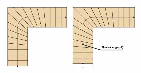 Линия хода проекция условной линии, идущая по рабочим рёбрам ступеней. Линия хода располагается на расстоянии 3-5 см от оси основного поручня, это среднее расстояние, приемлемое для взрослого человека, передвигающегося по лестнице. В случае узких лестниц линия хода совпадает со средней линией марша, в случае широких  смещается ближе к основному поручню. Принципиально важен этот параметр для лестниц с забежными ступенями: по линии хода ширина проступи всех ступеней (прямых, забежных, радиусных) должна быть одинаковой.